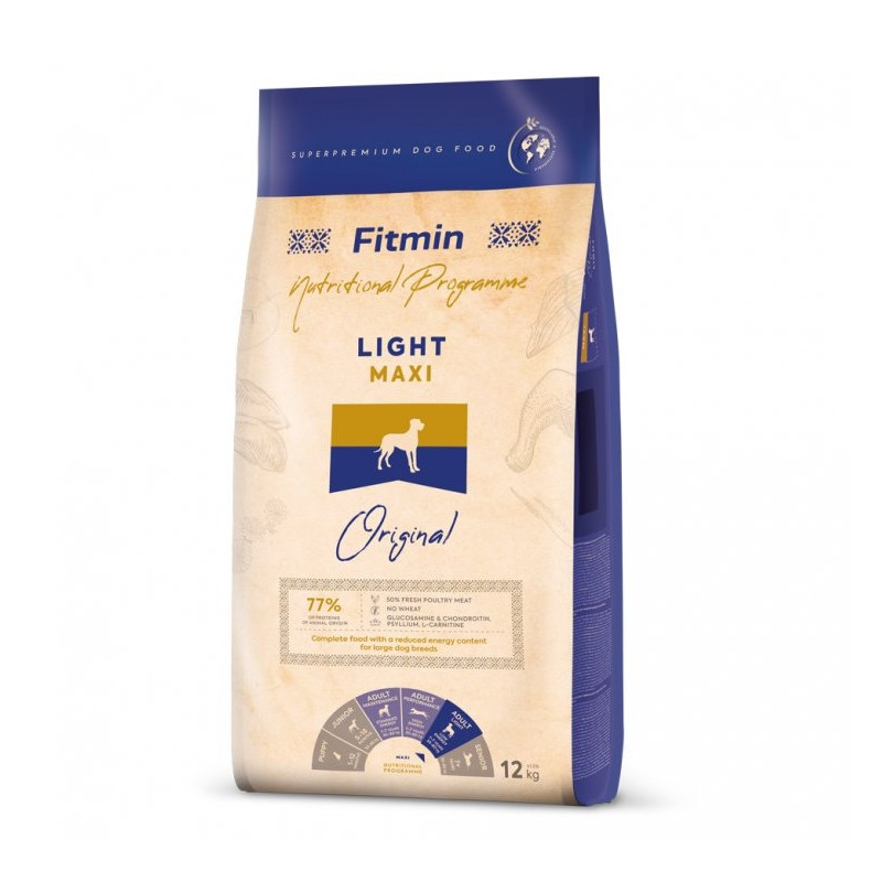 Superprémiové krmivo s čerstvým drůbežím masem, rybím masem a rýží garantuje smysluplné složení, které organismus zvířete dokáže efektivně využít. Tyto granule pro psy jsou postaveny na receptuře s rýží a kukuřicí, tedy obilovinami které neobsahují lepek a jsou hypoalergenní. I další suroviny jsou voleny velmi racionálně, a tak jsou vzhledem k vyššímu zatížení pohybového aparátu granule pro psy s nadváhou obohaceny o kloubní výživu, která je ve Fitmin krmivu ve správné výši a poměru. Další důležitou složkou k dosažení optimální kondice psa je L-carnitin, který podporuje odbourávání tuku a napomáhá chránit srdeční sval. Do každé Fitmin granule jsme přidali i dostatečné množství Psyllia pro pocit nasycení a jablečné a řepné vlákniny, která napomáhá pohybu potravy v trávicím traktu, stimuluje stahy střeva a podporuje činnost trávicích bakterií. Samozřejmostí pro Fitmin psí granule je i lněné semínko a lososový olej pro kvalitní srst, kůži a imunitní systém psa.